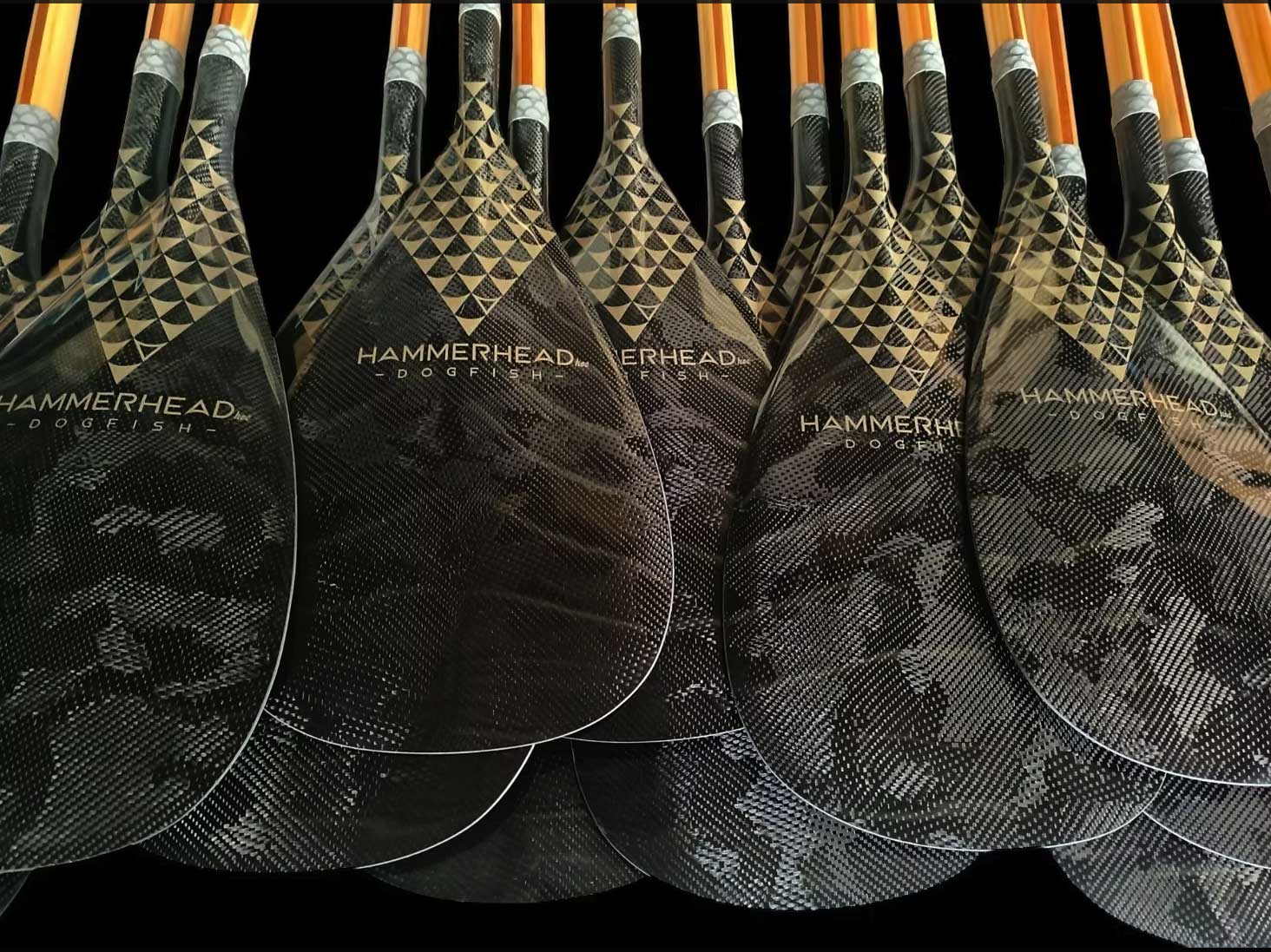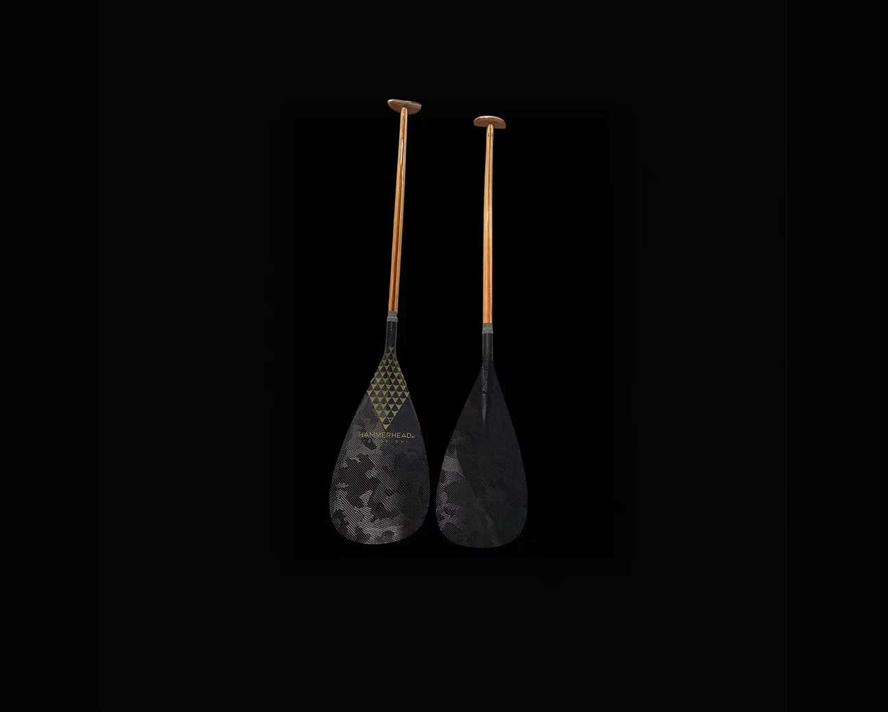 The Hammerhead - Dogfish - is a classic double bend hybrid outrigger paddle. It comes in a standard 9.5 inch/24cm blade width and has a 12° degree blade angle for sustained positive face power. We have paired the handcrafted three piece timber laminated shaft with a 3k Camo Carbon weave, which incases the PMI cnc’d foam core. It is light weight at +/- 500grams.