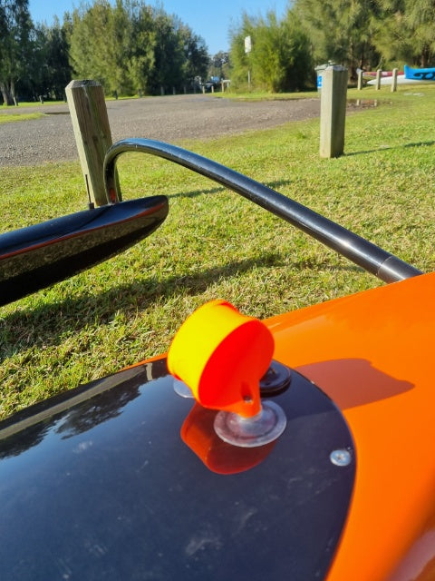 The 2 large suction caps stick easily to any smooth surface so perfect for your outrigger, ski, SUP, or canoe.