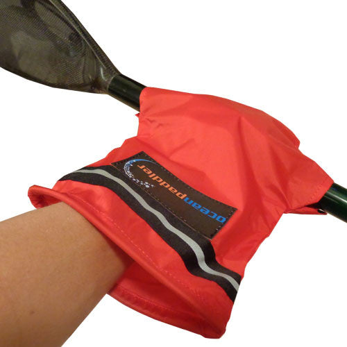 Pogies are paddle mitts made of coated nylon, using velcro to secure around the paddle shaft allowing the paddler to grip the shaft in the normal way while keeping water and wind off the hands.